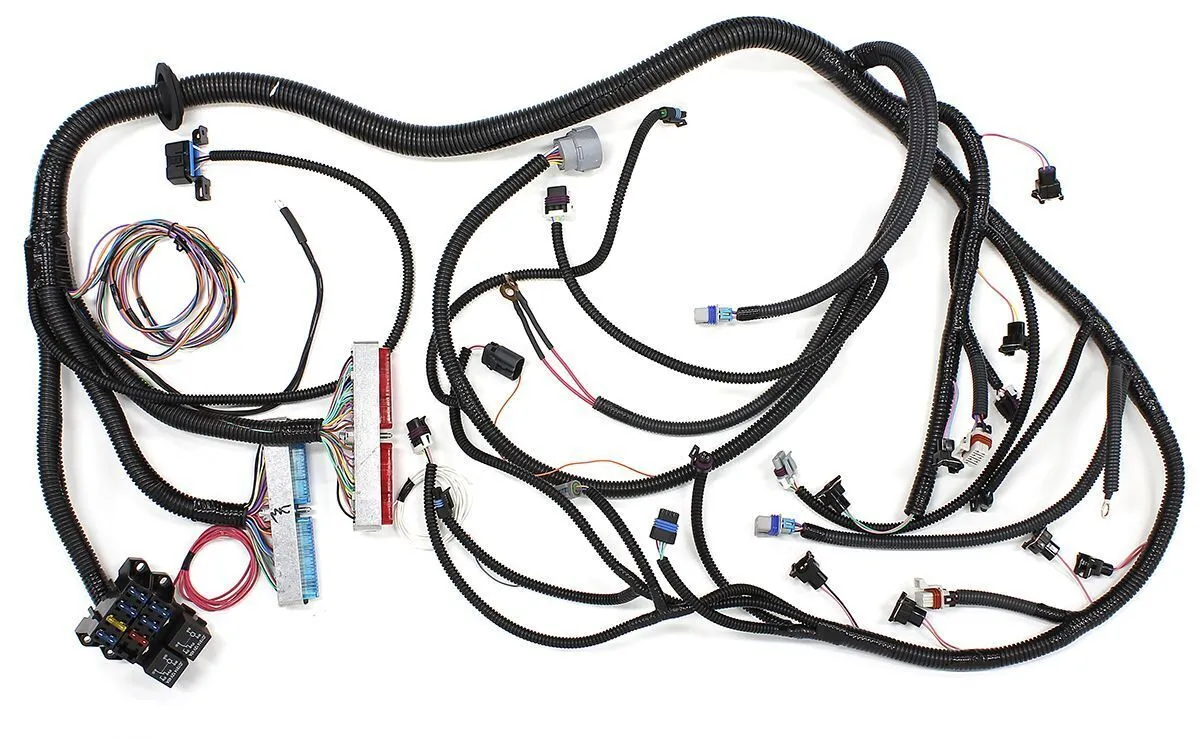 Aeroflow Performance wiring harness is designed to be a complete plug and play harness for EFI GM LS1/LS6 series engines. It is a complete standalone replacement wiring harness that suits GM LS1 engines (1997 to 2002) with drive by cable throttle body and 4L60E or 4L80E automatic transmissions. Perfect for retrofitting into older muscle cars and street rods or newer non-emissions-controlled vehicles with a four-wire hook-up (switched power, constant power and ground connections). The harness features a sliding grommet seal for a leak proof installation and 1.2 to 1.5 meters (3.9 to 4.9 feet) of length from the rear of the cylinder head to the PCM mounting position under the vehicle dashboard. The harness is constructed with GM Delphi connectors and terminals and high temperature wires. It includes all wiring that is required by the Powertrain Control Module (PCM) to run and control the fuel injection system and automatic transmission.