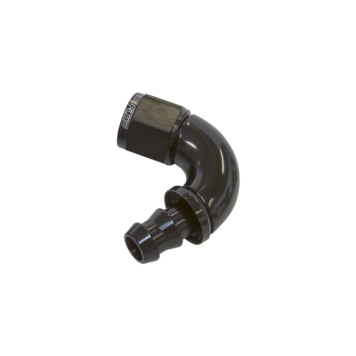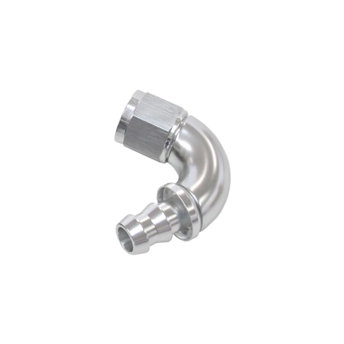 Aeroflow's 510 series push lock fittings are a CNC machined one piece fitting which provide uninterrupted flow. The mandrel bent tight radius body has superior wall thickness with a custom designed barbed end to allow a quick, easy and leak free assembly. Aeroflow's push lock fittings come with a purpose designed cover to hide the messy cut end of the hose to give you that professional look everytime. Compatible Hose: 400 and 500 Series Push Lock hose (Blue and Black).