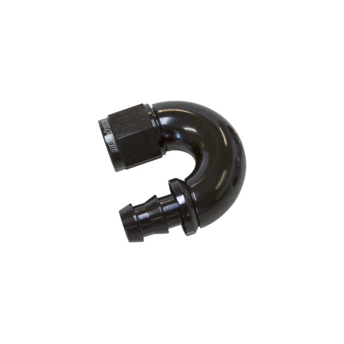 Aeroflow's 510 series push lock fittings are a CNC machined one piece fitting which provide uninterrupted flow. The mandrel bent tight radius body has superior wall thickness with a custom designed barbed end to allow a quick, easy and leak free assembly. Aeroflow's push lock fittings come with a purpose designed cover to hide the messy cut end of the hose to give you that professional look everytime. Compatible Hose: 400 and 500 Series Push Lock hose (Blue and Black).