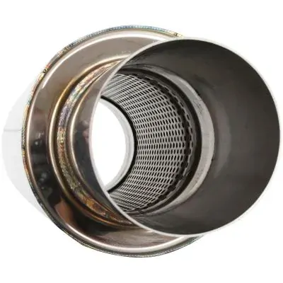 Aeroflow's 5500 series round mufflers are the perfect choice for today's street driven high horsepower turbo cars where both flow for maximum performance and dB reduction are critical. Manufactured from durable 16 gauge TIG welded 304 stainless steel. Aeroflow's 5500 series round mufflers are a packed style with perforated tube design that aids performance. Featuring a fully polished exhaust tip that measures over 5" long to allow universal fitment across many makes and models.