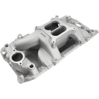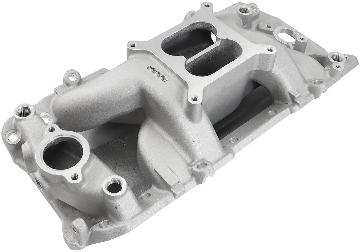 Get the maximum power from your carburetted engine with this Air Gap Big Block Chevy carburetted cast intake manifold. This dual-plane intake manifold is designed to keep your air and fuel distribution going into the engine at a steady and even flow for maximum performance and efficiency. The carburettor-mounting pad is designed to accept aftermarket square-bore carburettors with either manual or electric choke options available on today’s market. Specifically designed for 396-502 cubic inch big-block Chevy engines with large oval-port cylinder heads (1975 and earlier) operating from 1500 to 6500 rpm range. In most cases, these manifolds accept late model water necks, air conditioning, alternator and H.E.I. ignition systems.