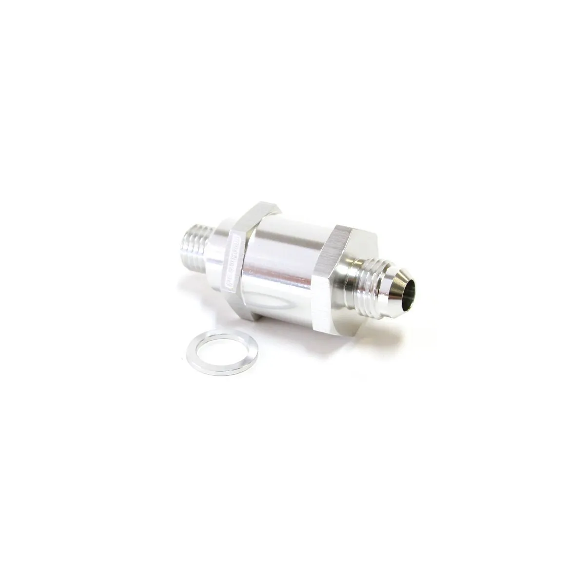 This CNC machined check valve screws directly into Aeroflow or Bosch EFI fuel pumps to hold line pressure and extend the life of the pump.