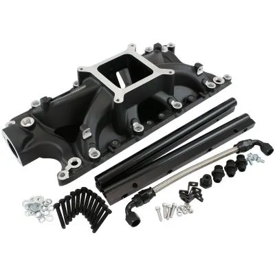 The fuel injector bores have back-cut exits in the intake runners for better fuel atomization. The fuel rails, brackets and mounting hardware are included with the manifold for easy installation with the injectors that you choose to use for your combination (fuel injector sold separately). Fuel rail is designed to allow a full length 14mm fuel injector (sold separately).