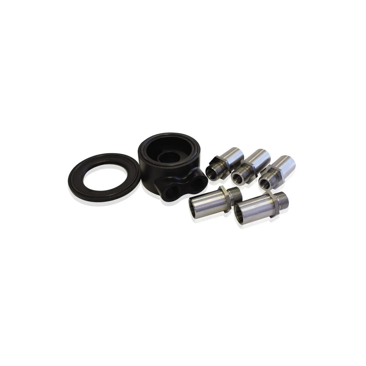 The main body is made from billet 6061 aluminium, then anodised black for great looks and corrosion resistance. This features two labelled inlet and outlet -8AN ORB ports provided for plumbing the engine oil to and from the sandwich adapter.