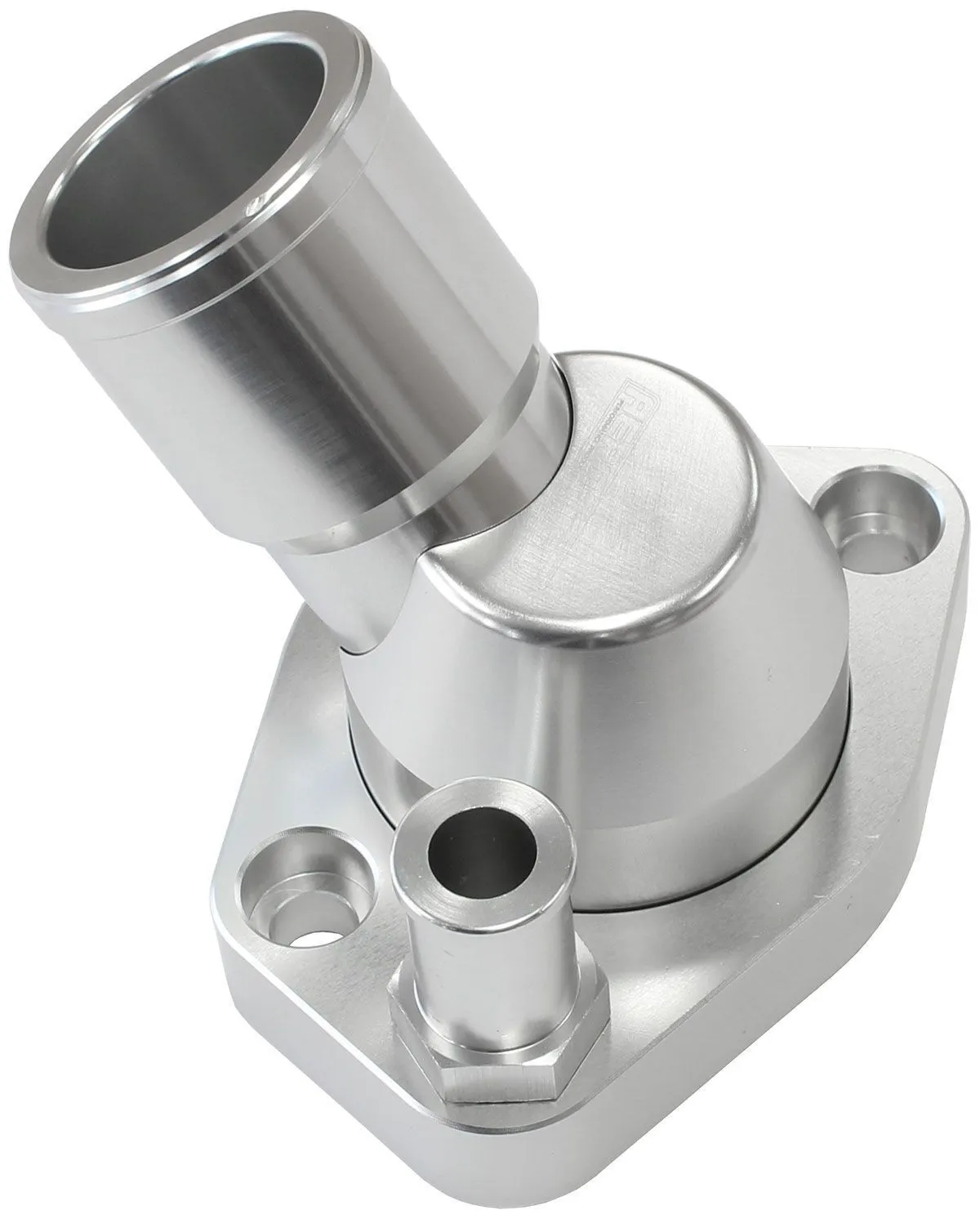 These 45 degree swivel thermostat is designed to suit small block Ford 289, 302 and 351 Windsor V8. Aeroflow Performance billet thermostat housings are a three-piece design that allows for correct positioning of the outlet to suit a large array for applications especially in conversions where size can be an issue. Machined from T6-6061 billet aluminium and allows for a full 360 degree swivel rotation for ease of installation. All Aeroflow Performance thermostat housings feature an O-ring base flange, as opposed to using the factory paper style gasket, this ensures a superior leak free seal. Each thermostat housing outlet can be un-screwed exposing a female 1-1/4"-20 thread to adapt a AN fitting or a larger barb fitting for custom applications. Available in several anodised finishes.