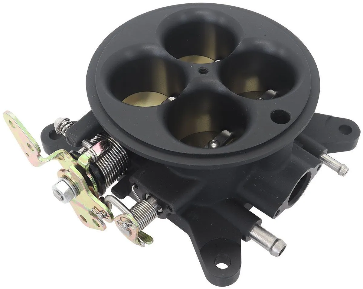 The Aeroflow Performance 4-barrel throttle body is the perfect complement for your fuel injection system. This high-quality diecast finished component is an affordably priced option compared to our billet version. This 1000 CFM throttle body utilizes 4150 pattern flange to suit a variety of intake manifold with 4150-style square-bore carburetor flange and standard bolt spacing. The 44.45mm (1-3/4)” bore is designed with a special radius which promotes maximum air flow and minimum turbulence 6.3mm (1/4”) thread in center for air filter stud.