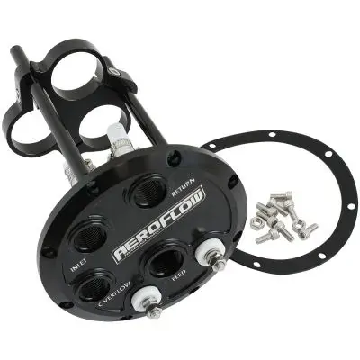 Deliver more fuel to your high-powered car with Aeroflow's low profile triple pump hanger kit! Our weld in low profile triple pump hanger is CNC machined from billet 6061-T6 aluminium with a black anodized option for maximum durability and corrosion protection against E85/Methanol. The 2-piece head incorporates a weld on ring for fabricating custom tanks. The Buna N O-rings provide a positive seal for the internal fuel log which has a -10ORB feed with a -8ORB return, overflow and inlet. Three -8ORB internal feeds with PTFE intake hose and clamps and single post electrical terminal bulkheads are provided. This billet hanger has the ability to mount one, two or three AF49-1242, AF49-1057 EFI fuel pumps or any 40mm diameter fuel pumps at one time. All 40mm fuel pumps used when staged must include a internal check valve to ensure fuel does not back feed into surge tank.