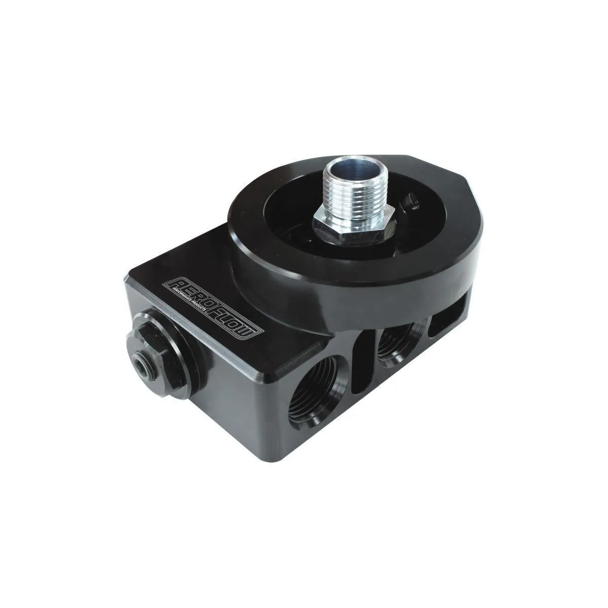 Perfect for use with Aeroflow oil coolers, this Billet Aluminium remote filter head and thermostat combines the engine oil filter and oil thermostat in one convenient unit. This is great for those wanting to remove extra lines and fittings required to run the thermostat in an separate location and frees up extra space for conversion cars.