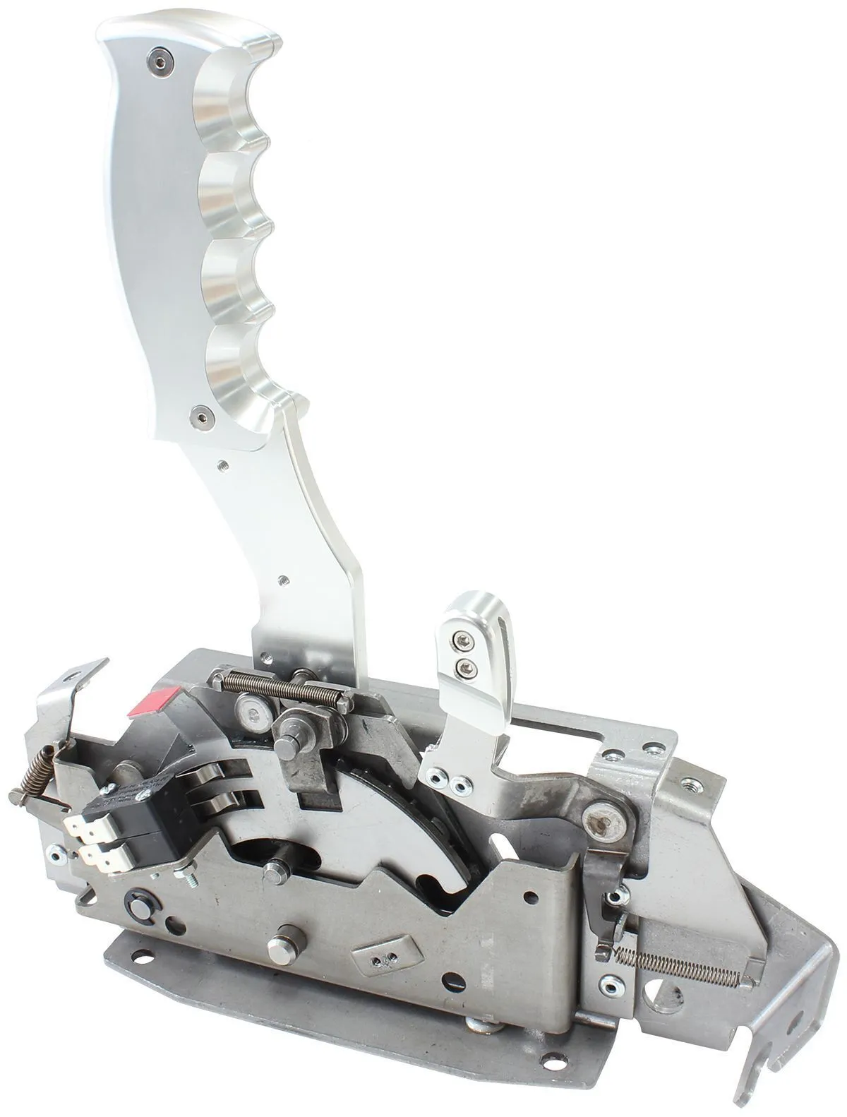 The Pistol shifter includes a reverse lockout feature that only requires one hand to operate, two micro-switches for reverse lights and a neutral safety switch preventing accidental starts when in gear all to keep the engineer happy and your vehicle safe. The Pro Grip handle attached to the shifter stick is a handy two-piece bolt together design that allows interchangeable billet side plates.