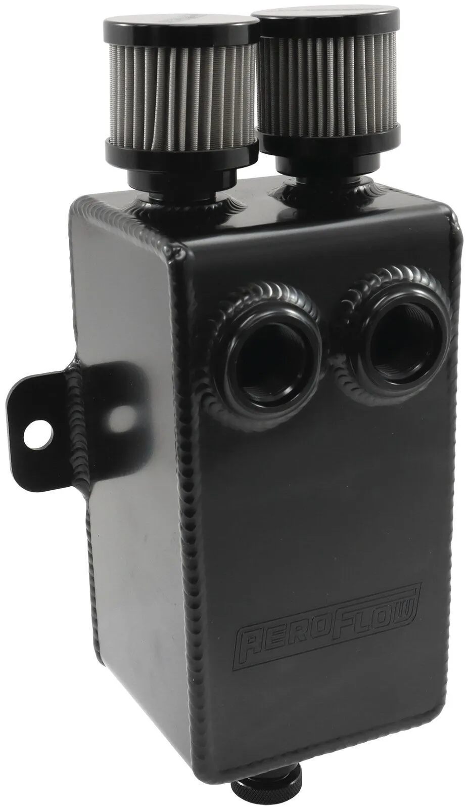 Aeroflow's 1L / 33oz Universal fabricated aluminium breather tanks are skilfully built. They come in either highly polished or gloss black anodised finish with an integral mounting bracket. The tank is baffled and features two -10 female ORB ports on the front to suit all size lines when used with an appropriate adapter. The top features two male -10an fittings for breather filters to be screwed onto them. At the base we have a -10ORB billet valve that can be remotely plumbed as an oil salvage or remote drain.