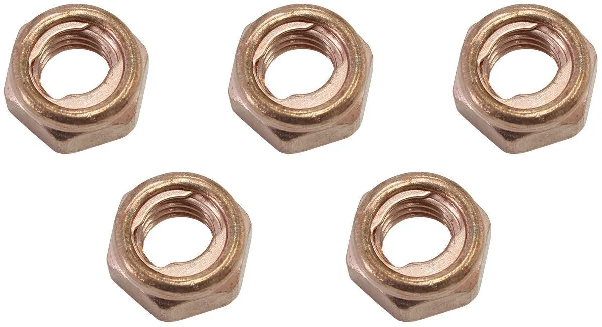 These copper locking nuts from Aeroflow are used in conjunction with our exhaust studs. The lock nut is just like a standard nut, but it has the added function of locking itself to the stud (thread). The main benefit of using lock nuts is once installed the chances of it working itself loose are greatly reduced.