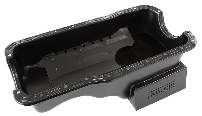 Aeroflow's range of super oil pans available for most popular V8 engines are the perfect choice for street or track driven high performance engines. These pans start out as new stamped steel pans which are customised with specially designed extra oil capacity wings. These wings allow extra oil capacity without affecting ground clearance which helps maintain more constant oil temperatures for reliability and feature windage trays and crank scrapers. Available in black finish. Pans have 6.5 Litre (6.86 US Quarts) capacity.