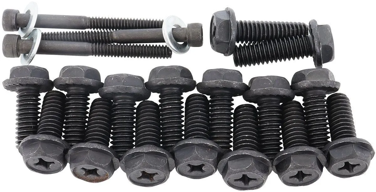 Aeroflow automatic transmission oil pan bolts keep your oil transmission pan in place. These bolts are custom made to exact specifications for a precise fit. Machined from hardened, grade 5 steel and includes a durable black coated finish to enhance the look of your new transmission pan. Each set consists of fourteen 5/16-18" x 3/4" black hex head bolts with a Phillips head built inside the hex head so ease of installation. The serrated faced head on each bolt provide extra grip on the oil pan rail which will prolong the life of the gasket and prevent oil leaks down the line. Designed for use on Ford, GM and Chrysler transmissions.