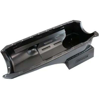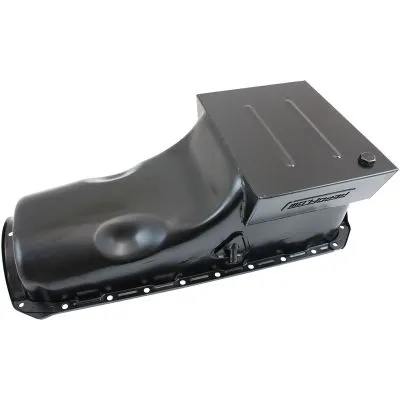 Aeroflow's range of super oil pans available for most popular V8 engines are the perfect choice for street or track driven high performance engines. These pans start out as new stamped steel pans which are customized with specially designed extra oil capacity wings. These wings allow extra oil capacity without affecting ground clearance which helps maintain more constant oil temperatures for reliability and feature windage trays and crank scrapers. Available in black finish. Pans have 6.5 Liter (6.86 US Quarts) capacity.