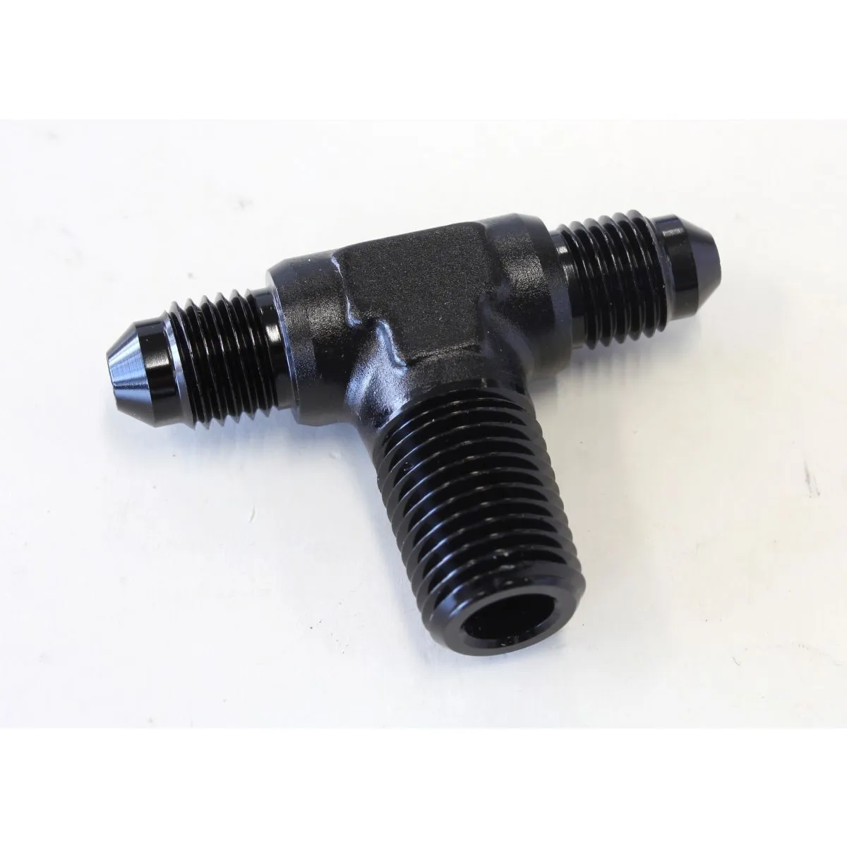 These AN male Tee pieces feature an NPT male fitting on the side, allowing two AN lines to be run from one NPT threaded outlet. Various sizes available -3 to -20 and varying NPT sizes.