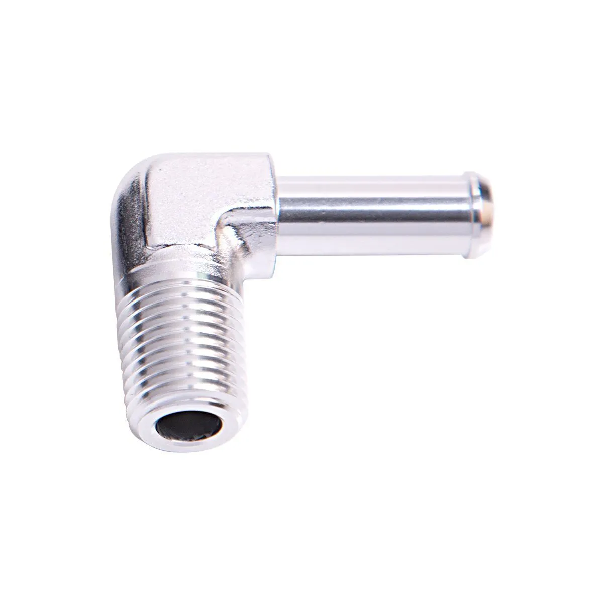 These handy NPT to 90 degree hose barb fittings are designed to allow easy fuel line installation on electric fuel pumps and regulators when using rubber fuel line. They have a male NPT fitting on one end and a barbed fitting on the other end and they're available in different sizes to fit your needs.These barb sizes are designed to work with Aeroflow 400 series and 500 series Push Lock Rubber hose. Available in various sizes with Blue, Black and Silver finishes.