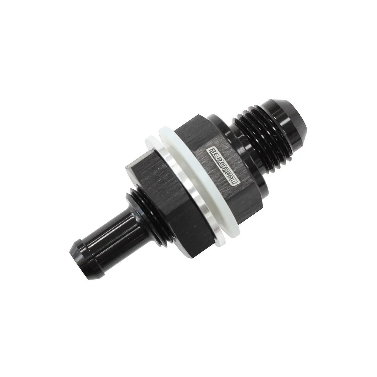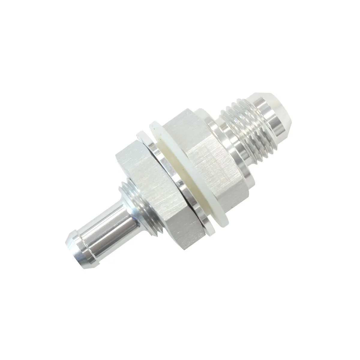 This Aeroflow Performance high flow bulkhead fitting is designed for use in fuel cells.  They feature a radius on Inlet for unrestricted flow. Each bulkhead fitting includes 2 PTFE washers and a bulkhead nut. These fittings can also be used for adding a breather to a valve cover, or a drain on a fabricated tank whether it is a plastic or metal material.