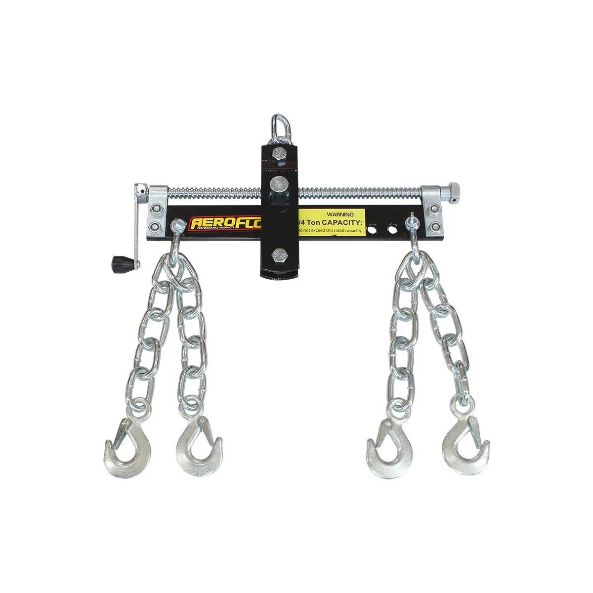 The Aeroflow Performance engine leveling tool is the perfect companion for our engine crane when it comes to removing the engine from the vehicle. It reduces the hazards and hassles out of balancing heavy, awkward loads and helps protect engines, transmissions and vehicle damage. This handy tool connects to your engine crane hook and adjusts the angle of the engine simply by turning the swivel handle. The leveller will tilt both forward and backward for easy motor mount alignment with the worm drive shaft that rotates with a built-in swivel handle for easy balancing. The load leveller includes four adjustable 300mm chains with hooks for increased load security and safety that will balance up to 740kg (1650lbs).