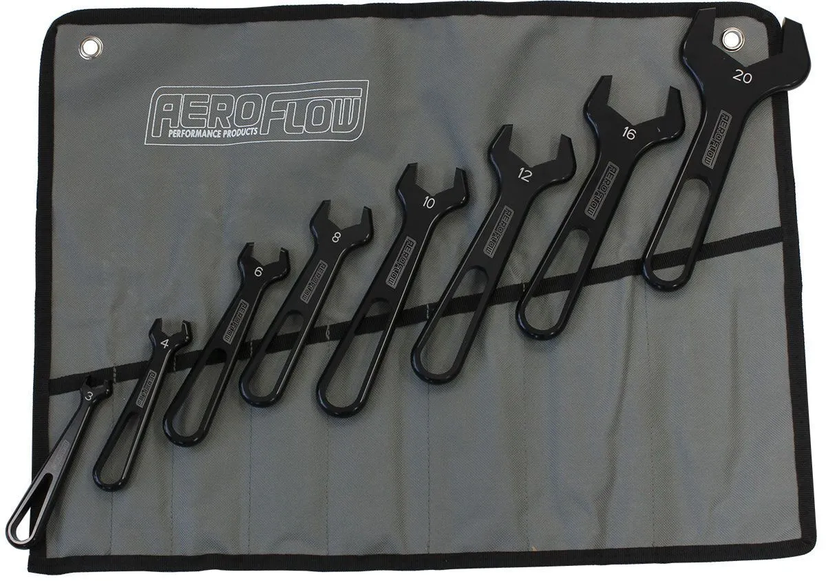 The Aeroflow Pro AN Spanner is perfect for all hose end assemblies and adapter fittings, providing a perfect fit so they won't mark your fittings. They are Slimline enough to get into all corners of tight spacers.  All aluminium spanners are hard anodized black and size stamped. Being a single ended spanner set they will fit designed to suit B nuts of AN fittings, including 8 sizes from -3AN to -20AN. Recommended to also use in conjunction with the Aeroflow Performance adjustable wrenches or vice jaws to install braided hose to fittings. Available in a complete kit with a Pro Spanner roll up bag for protection included or each Pro AN spanner is sold separately as well.