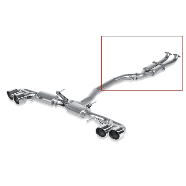 Titanium front Link Pipe set for GT-R R35. With Semi-Hemisphic joints, flowed crosspipe and high flow resonators. Use to upgrade your Akrapovic Slip-On system to full Evolution.