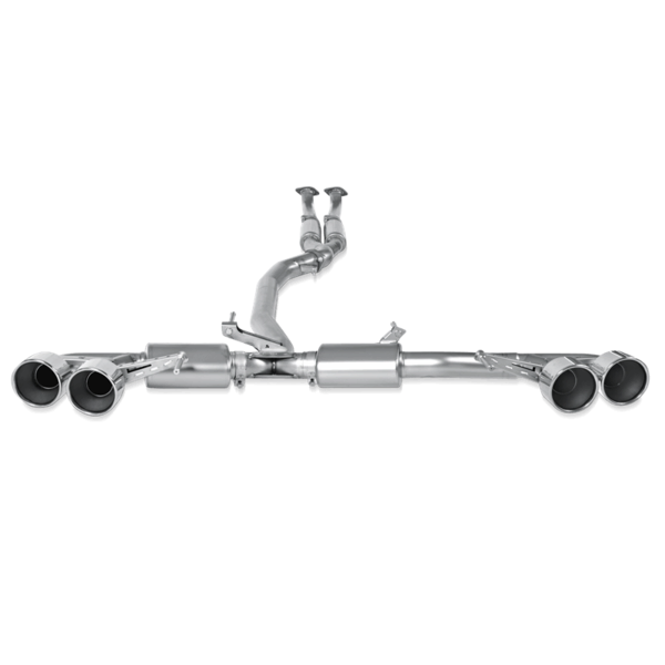 The Evolution performance exhaust, made of our proprietary titanium, is an even better match for the GT-R, complementing its race-inspired looks. Substantial work by the R&D team was required to achieve impressive horsepower and torque output increase over stock, with gains being realized at the redline and throughout the entire rpm range. There are substantial reductions in weight achieved through careful design and the use of light titanium. The power-to-weight ratio improves on both fronts: power increase and weight reduction. The GT-R deserves a great sound and the Akrapovic Evolution system delivers it: deep, loud, and aggressive but without droning. Complete with a set of four exquisite tailpipes carbon fibre.