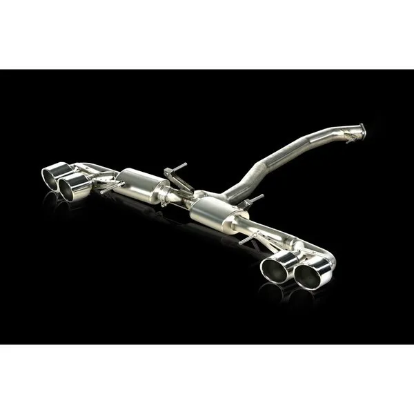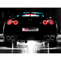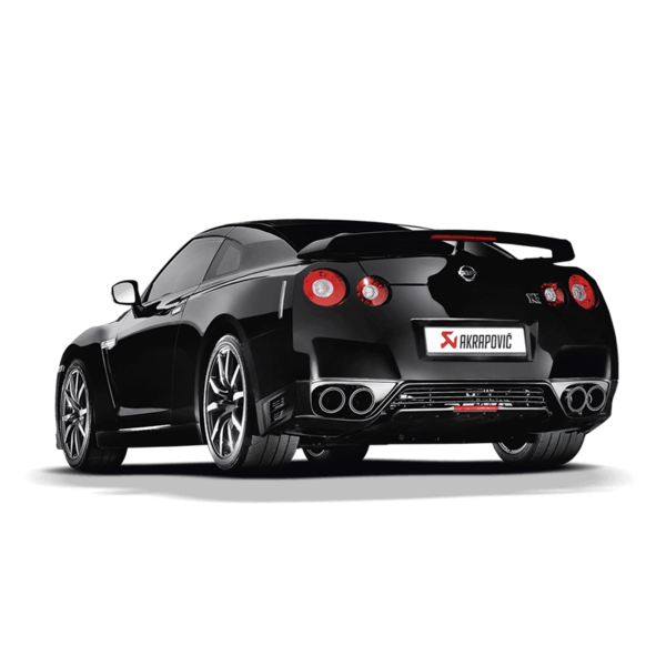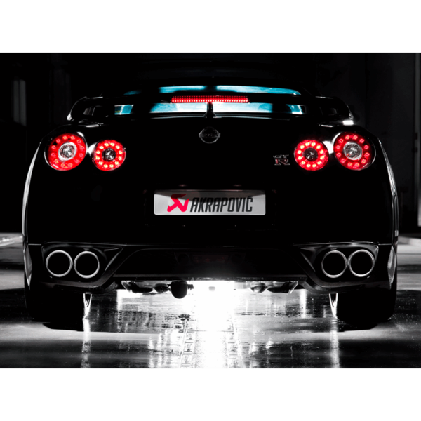 The Nissan GT-R is one of the fastest cars to race on Germany's famous Nurburgring Nordschleife (North Loop). To enhance this already impressive performance, we offer our Akrapovic Slip-On exhaust system made completely of our proprietary titanium. This beautifully crafted sport exhaust achieves weight reduction and delivers power improvement, most noticeably at the top of the rpm range. The sound is also improved, with a deeper, sportier sound delivered without droning, and this perfectly complements the car. The attention to detail can be seen in every component. Even the exhaust tailpipes were designed to resemble the trademark GT-R tail lights. Complete with a set of four exquisite tailpipes in carbon fibre.