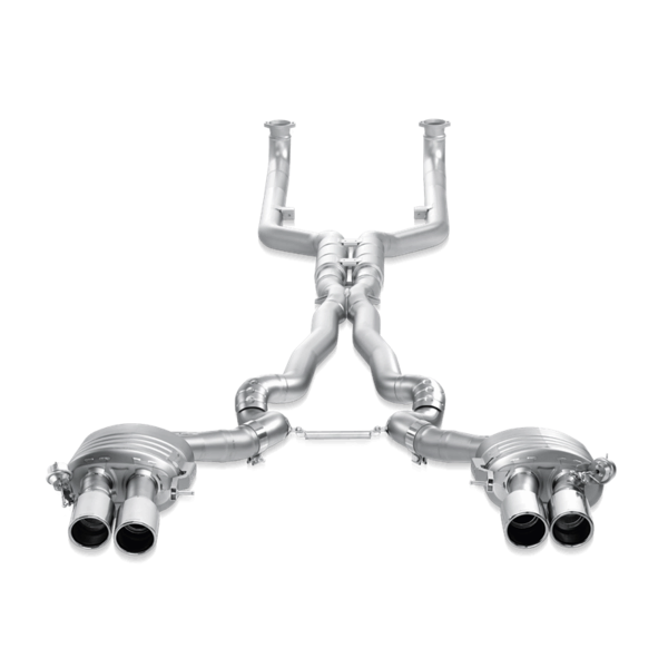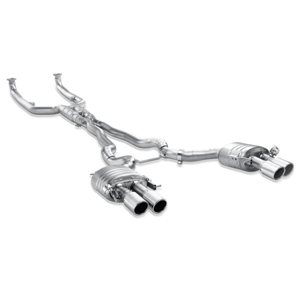 The Evolution exhaust system made of our proprietary titanium consists of newly developed dual-outlet mufflers with exhaust valves, flow-optimized pipes, and a unique cast titanium X-shaped part with resonators. Back pressure is lowered and the M6 benefits from more power throughout the entire range of rpms. It increases responsiveness and an improved power-to-weight ratio has been achieved without removing the catalytic converters. The Evolution performance exhaust offers a deep sporty sound, growing to an aggressive roar when driven hard but without droning. It works well with the M6’s ANC system - just like the valve system, which is regulated through the M6’s settings.
