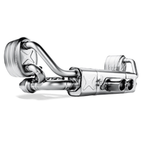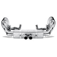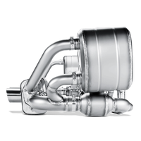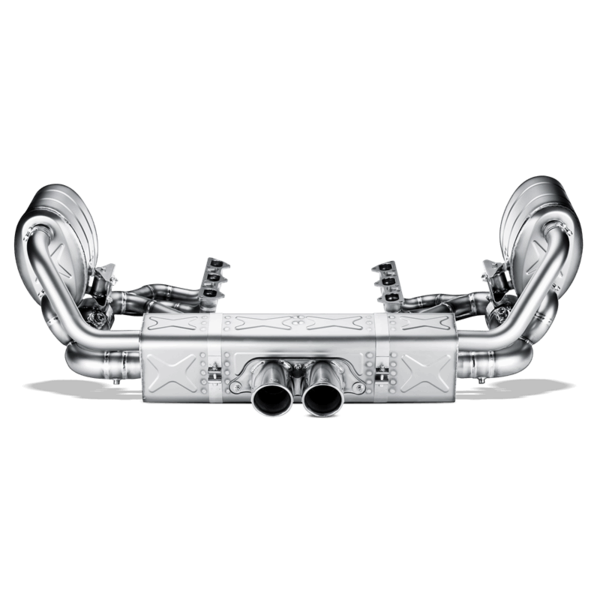 The fully titanium Evolution exhaust system complements the Slip-On muffler and tailpipes with a newly developed exhaust manifold with 100 cpsi sports catalytic convertors that guarantee an increase in power and torque, as do the newly developed and optimized pre-mufflers. However, the real plus of this performance exhaust system is the weight reduction, while it maintains the original layout and functionality of the exhaust caps. Because of the weight reduction in the area behind the engine and the rear axle, the weight savings enhance the handling. The sound impression in this configuration is somewhat more voluminous and with opened caps and more aggressive than in the original version. The unique look is completed with the mandatory rear carbon fibre lip 01-08-28-0001.