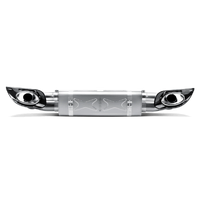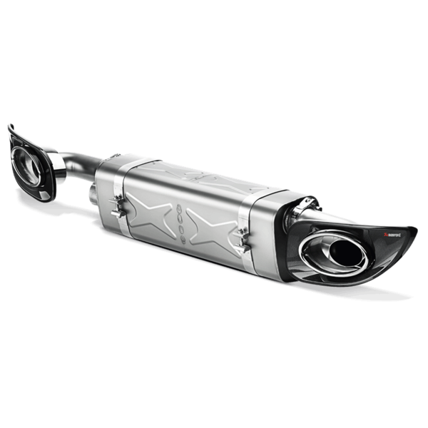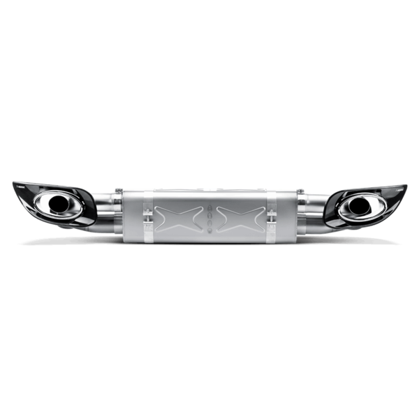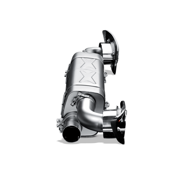We begin with our very lightweight center muffler made of our proprietary titanium alloy. Replacing the stock center muffler alone reduces the weight at the back of the car. Each center muffler kit also includes beautifully handcrafted carbon fibre bumper inserts with integrated titanium exhaust tailpipes. Through careful design we were able to produce an exhaust system that has a deep and aggressive sound without being unpleasant or intrusive during normal driving conditions. The next option is to replace the stock link pipes with the optional available Akrapovic variant made from titanium and incorporating high-flow catalytic convertors. In order to increase the power beyond the limit of 500 hp, ECU reprogramming will be required.