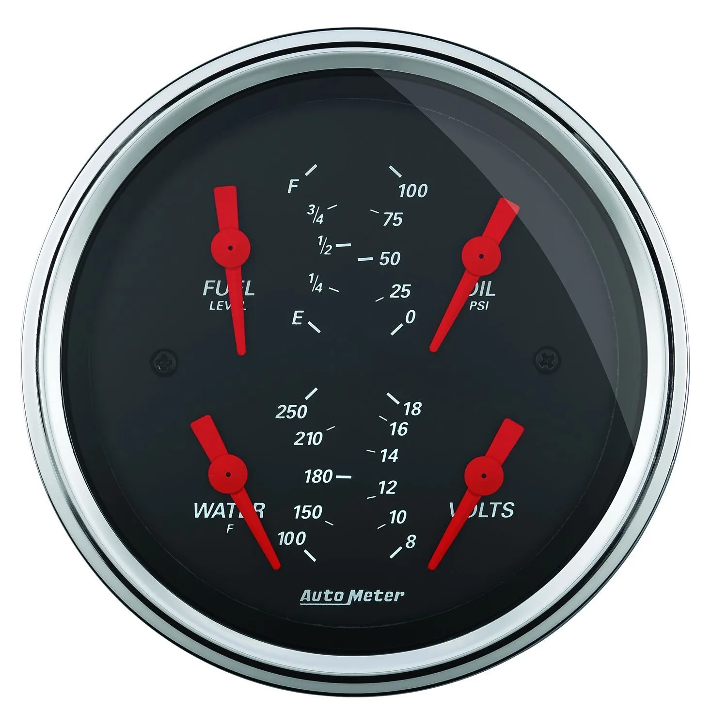 Sometimes space is limited. The AutoMeter Quad Gauge provides a solution to limited dashboard space while providing a clean look. Individual AutoMeter air core meter movements for each function provide the accuracy and durability required by even the most demanding applications. Includes a single wire 1/8” NPT temperature sender and a 1/8” NPT oil pressure sender. The voltmeter reads from 8-18v on negative ground electrical systems and fuel level resistance range is 0 ohms empty to 90 ohms full (compatible with Amid 60’s through mid 90’s GM fuel level senders).
