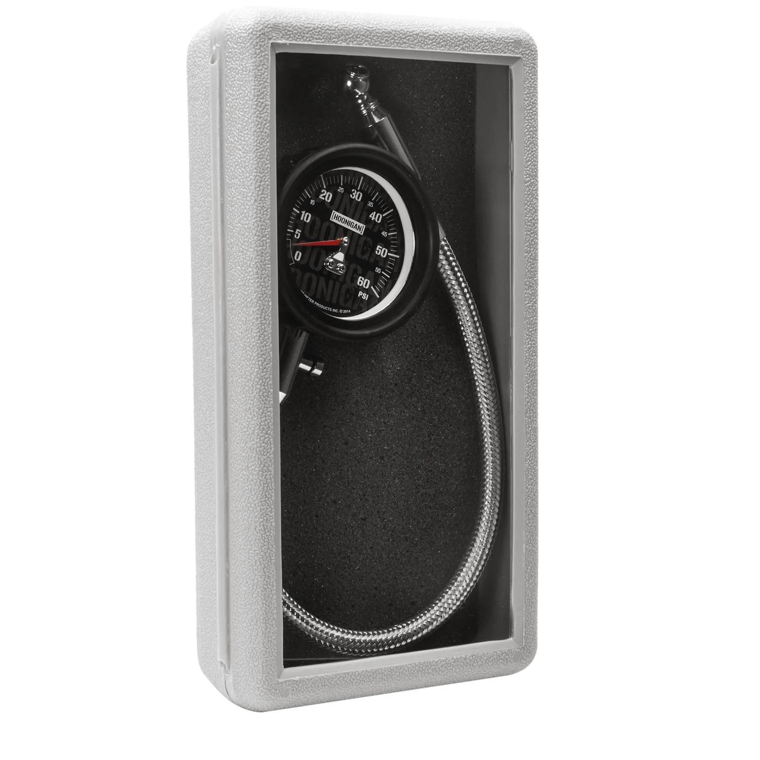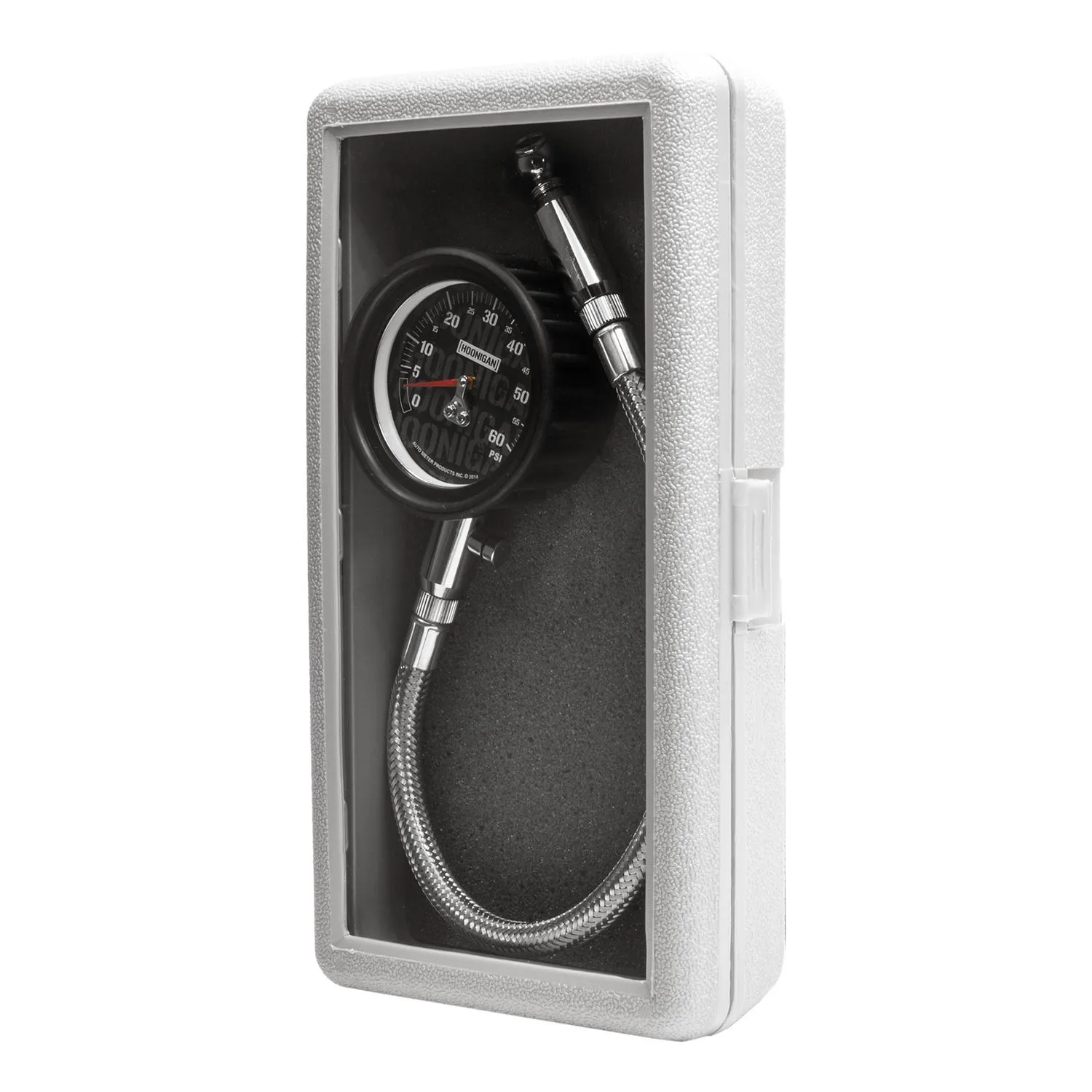 "At Hoonigan, we have a penchant for killing tires. We are constantly dialing in air pressure for optimal tire destruction and, luckily, Autometer came through to help us out!” - TheHoonigans When the master tire slayers from the Donut Garage approached the gauge experts at AutoMeter for assistance in developing an instrument to fine tune their petrol-fueled exploits, we were only too happy to oblige. At the heart of each matte black AutoMeter X Hoonigan 60 PSI tire pressure gauge is a precision movement featuring a large 2.25 in. dial emblazoned with a subtle Hoonigan stamp design inspired by the mythical Hoonicorn. Bold, white pressure increments located every 2.5 PSI and high contrast red needles assure easy readings of the smallest tire inflation tweaks. Accented by functional brightwork, these instruments are fitted with 10.5 in. braided stainless lines for durability and include 360-degree swivels at each end for optimum articulation and valve stem access. AutoMeter X Hoonigan Tire Pressure Gauges are finished with a rugged, no-slip grip housing for maximum shock protection, a thumb-operated pressure bleed for air-down adjustments, and come individually packaged in hard storage cases for protection from errant tools in the shop and the wandering hands of The Unprofessionals."