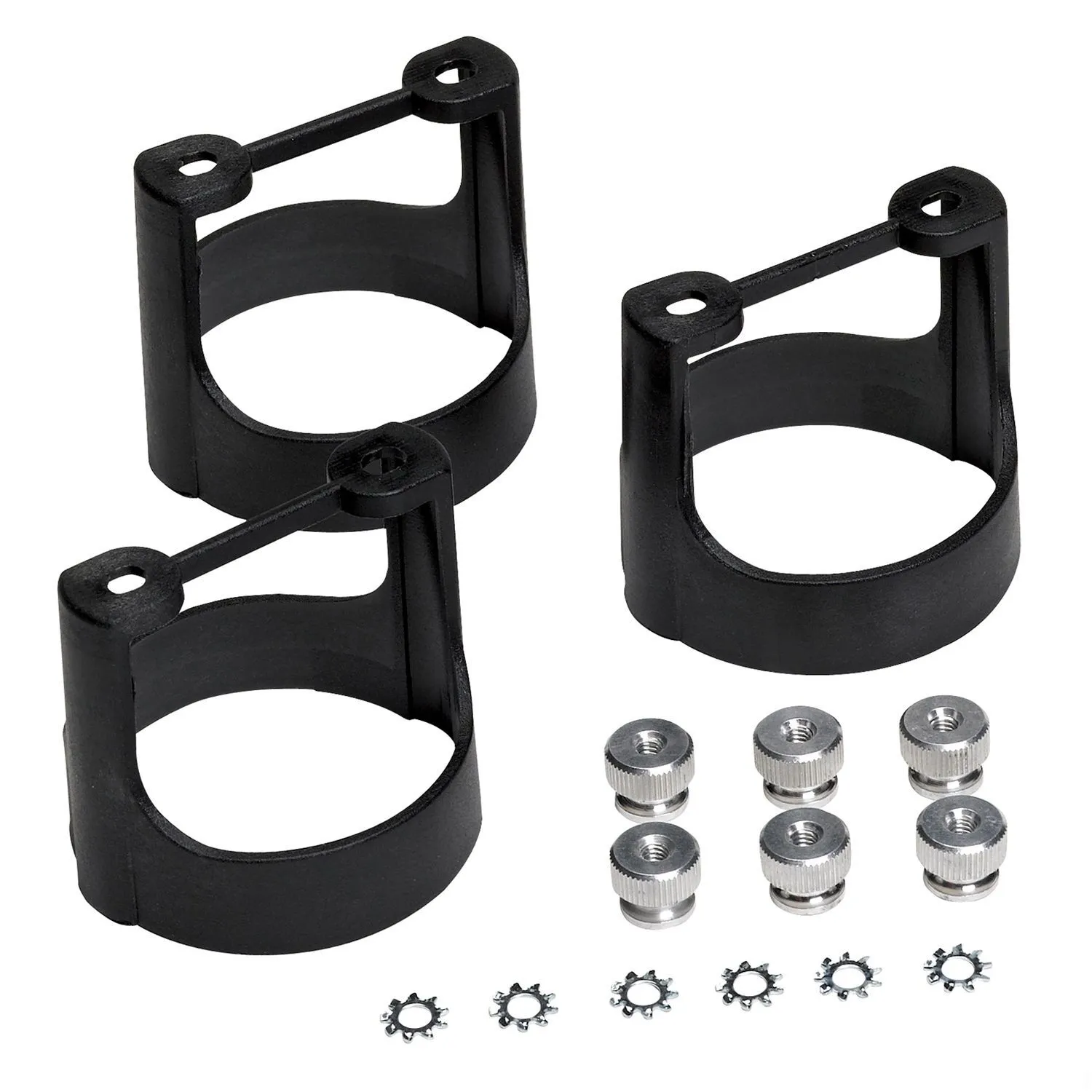 Quality molded black plastic mounting brackets with aluminum thumb nuts and washers. Package of 3.