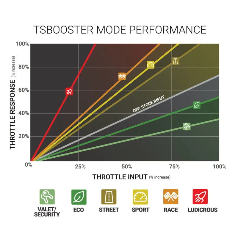 Say goodbye to that dead, laggy throttle pedal felling and enjoy quicker engine response and acceleration with the BD Power TS Booster. The TS Booster amplifies the signal between the throttle pedal and ECM to give a quicker reaction time and forces your performance curve to occur sooner, achieving quicker engine response and a 'fly back in your seat' feeling. Factory connections mean a painless install giving you six acceleration levels and a security mode. No need to program, the TS Booster sophisticated A.I. will do the work for you, learning the appropriate settings for your particular application from your throttle inputs. TS Booster doesn't affect warranty or tamper with emissions.