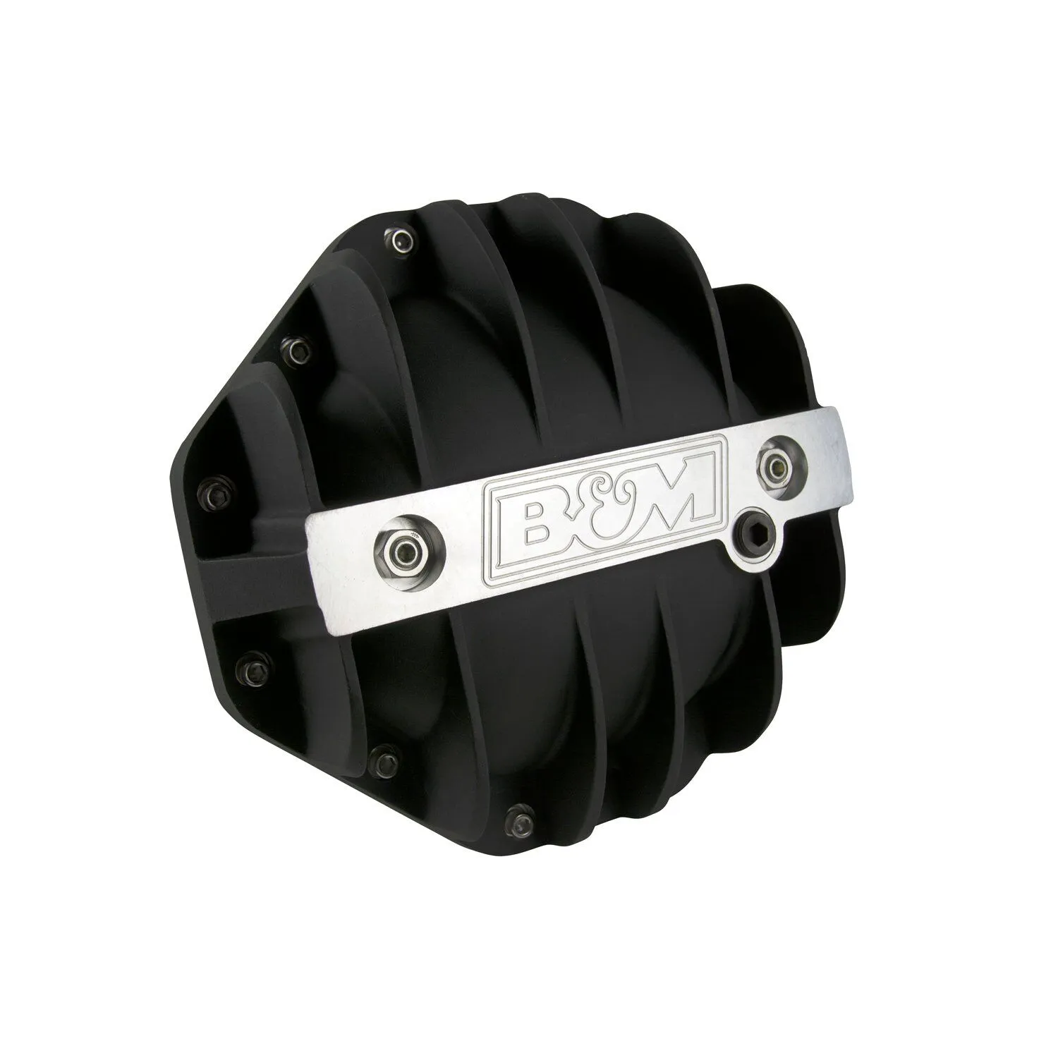Our engineers designed the line of Hi-Tek differential covers to not only look good but address a number of weaknesses of the factory-stamped steel covers. First, they started by constructing the covers of thick A356.0-T6 aluminum, which dissipates heat much faster than the factory steel unit keeping the fluid temperature lower under high-stress loads vs. a steel cover. Then for added durability, we added a reinforced center bar for extra strength along with load bolts to help prevent bearing cap deflection under severe loads. The internal shape of the cover retains the smooth round back internally to help keep the fluid flow going over the ring gear to properly lubricate the gears and bearings. Additional features include a magnetic drain plug for catching ferrous metal particles, MIL-Spec (MIL-A-8625) black anodized finish, machined B&M logo, and all necessary hardware and easy-to-follow detailed instructions for a quick and simple installation you can do at home.