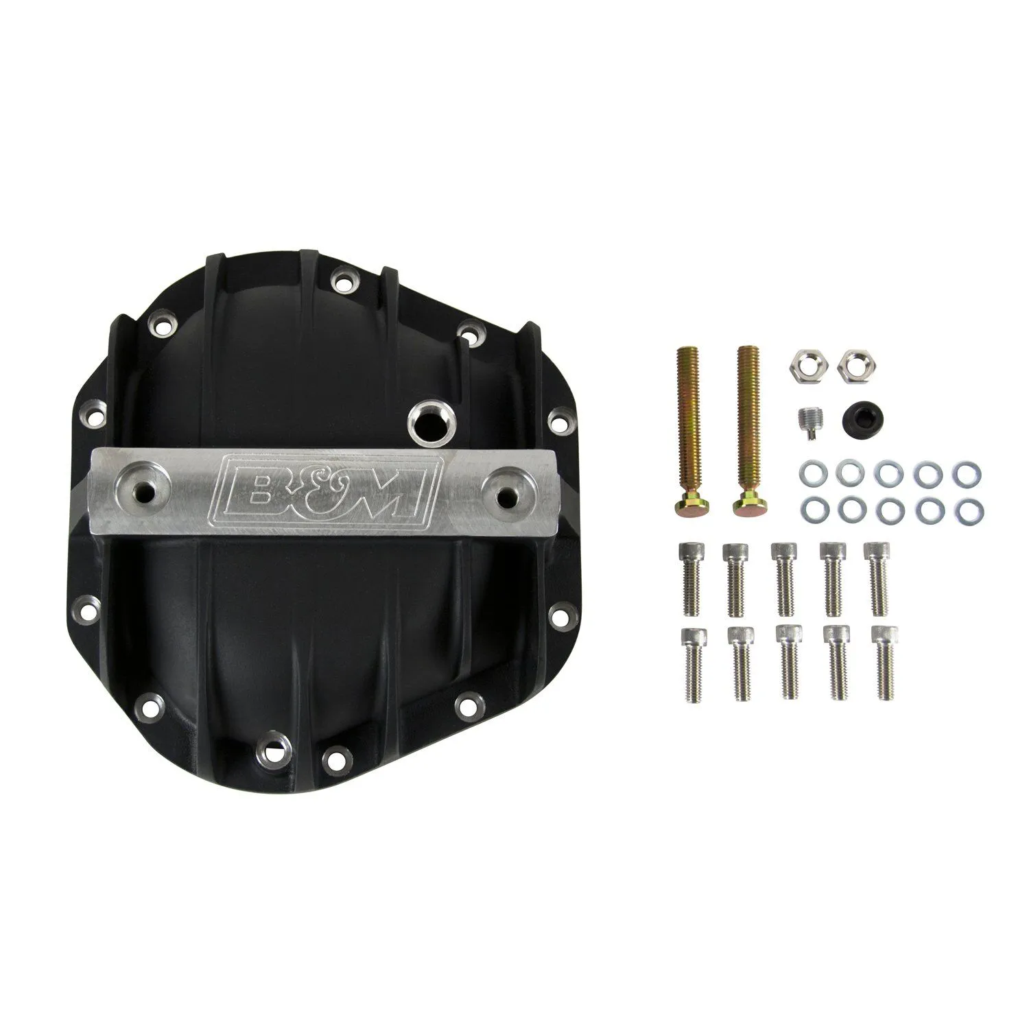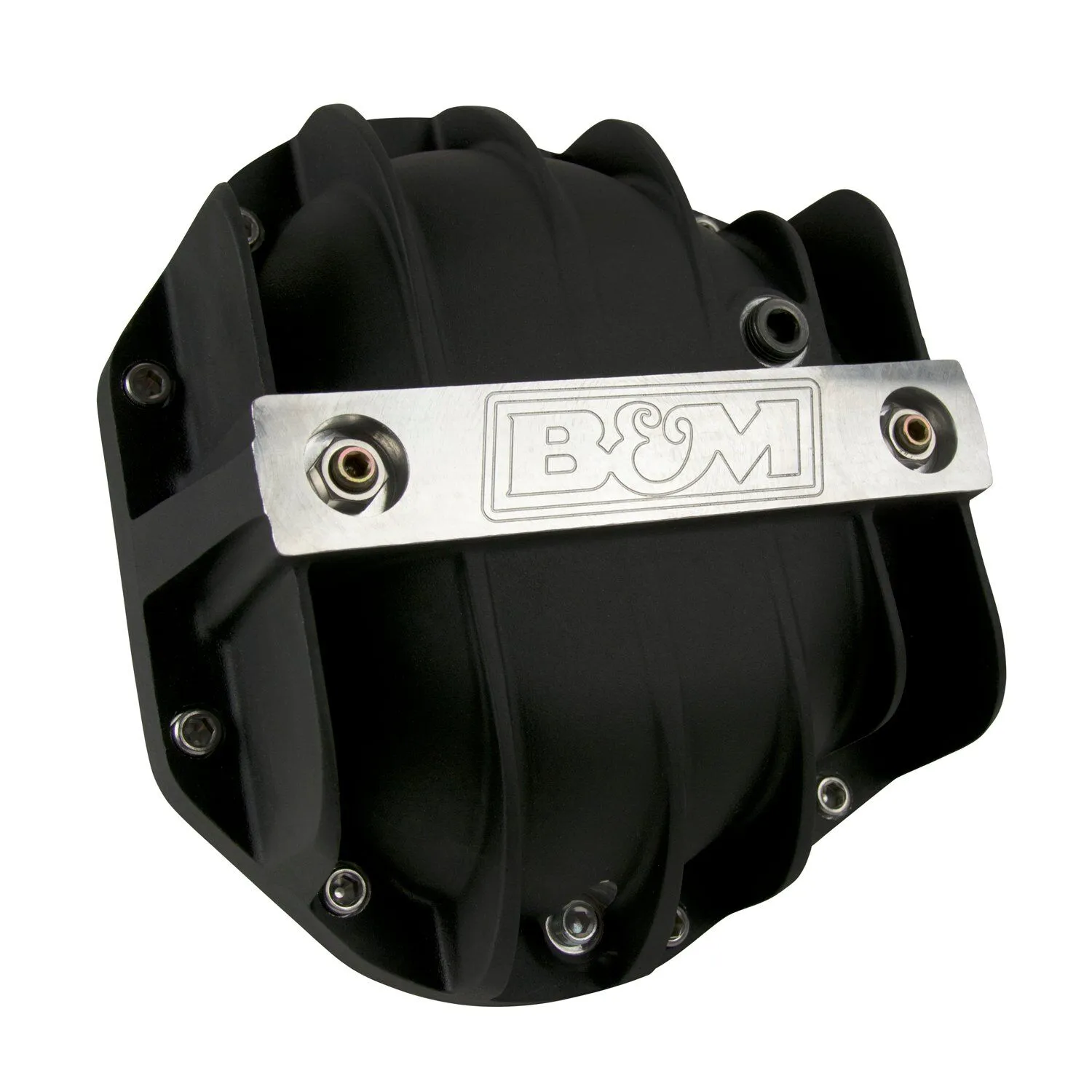 Our engineers designed the line of Hi-Tek differential covers to not only look good but address a number of weaknesses of the factory stamped steel covers. First, they started by constructing the covers of thick A356.0-T6 aluminum, which dissipates heat much faster than the factory steel unit keeping the fluid temperature lower under high-stress loads vs. a steel cover. Then for added durability, we added a reinforced center bar for extra strength along with load bolts to help prevent bearing cap deflection under severe loads. The internal shape of the cover retains the smooth round back internally to help keep the fluid flow going over the ring gear to properly lubricate and cool the bearings and ring & pinion gears. Additional features include a magnetic drain plug for catching ferrous metal particles, MIL-Spec (MIL-A-8625) black anodized finish, machined B&M logo, and all necessary hardware and easy to follow detailed instructions for a quick and simple installation you can do at home. Note: Gasket not included.