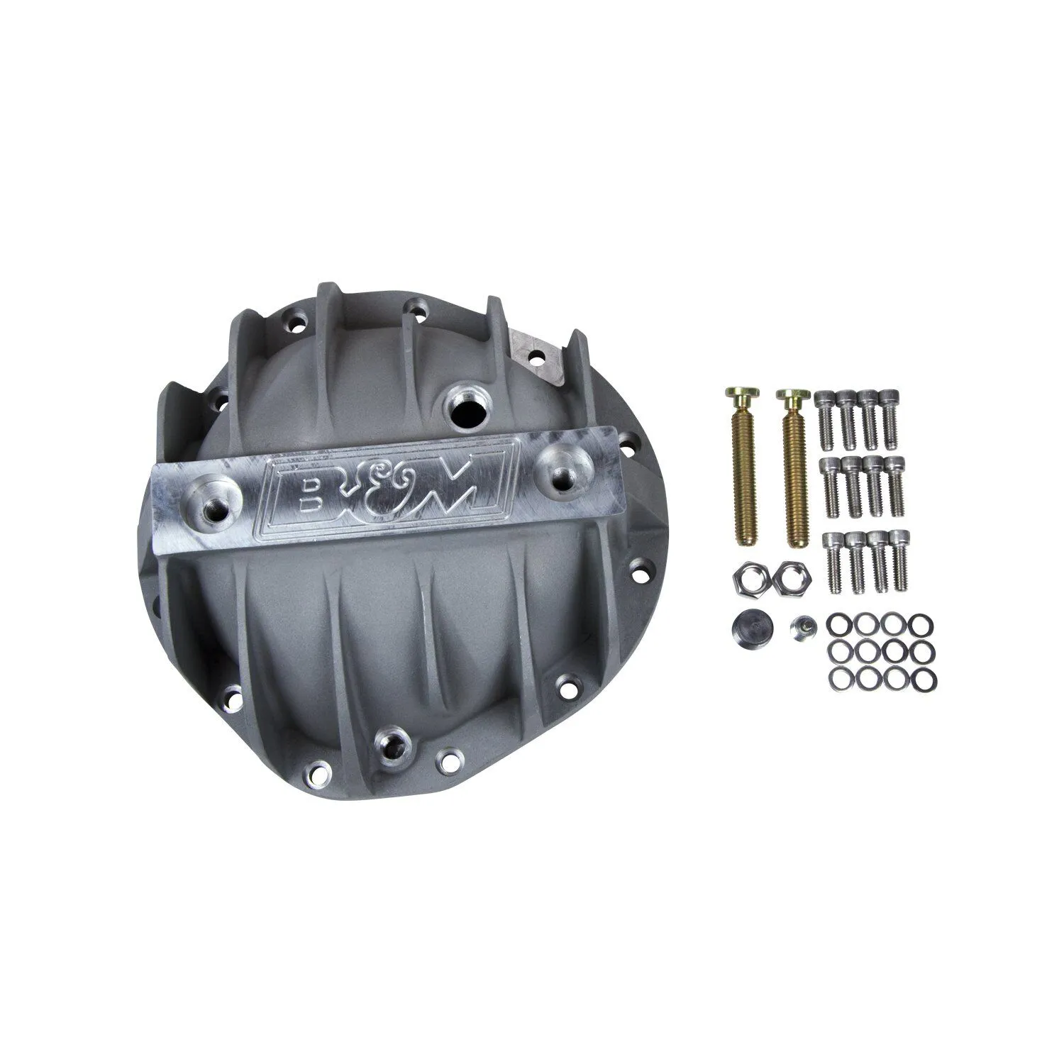 Our engineers designed the line of Hi-Tek differential covers to not only look good but address a number of weaknesses of the factory stamped steel covers. First, they started by constructing the covers of thick A356.0-T6 aluminum, which dissipates heat much faster than the factory steel unit keeping the fluid temperature lower under high-stress loads vs. a steel cover. Then for added durability, we added a reinforced center bar for extra strength along with load bolts to help prevent bearing cap deflection under severe loads. The internal shape of the cover retains the smooth round back internally to help keep the fluid flow going over the ring gear to properly lubricate the gears and bearings. Additional features include a magnetic drain plug for catching ferrous metal particles, machined B&M logo and all necessary hardware and easy to follow detailed instructions for a quick and simple installation you can do at home. Note: Gasket not included.
