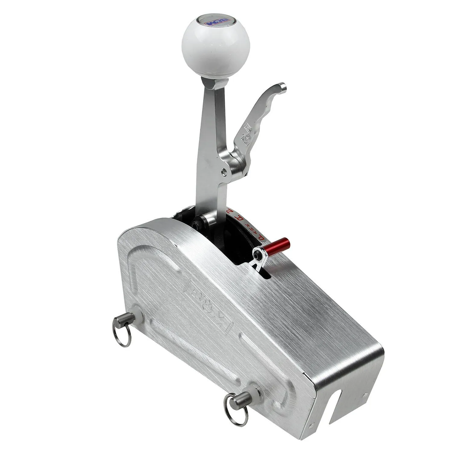 The Original Pro Stick shifter delivers rock-solid performance, mixed with clean design cues and compact size. This is why you see so many Pro Stick shifters at the race track. We start off with a heavy duty steel base with a hardened steel gate plate, a reverse lockout feature that only requires one hand to operate, and complies with NHRA/IHRA safety rules. Then add the billet aluminum shift handle with classic white shift knob, lightweight aluminum trigger and finish it off with a brushed aluminum cover with quick release pins, and you end up with one good looking bullet-proof race shifter. This model Pro Stick comes out of the box ready for action for 1962-1973 GM Powerglide transmissions with forward shift pattern, includes a 5-foot Super Duty shift cable, cable bracket, PG Pro Lever, hardware and detailed instructions for an easy installation. Be sure to check out the optional classic white shift knob with 12-volt momentary switch, or all the other accessories we offer for the Pro Stick in the Shifter Accessories section. Overall Dimensions - 8.25L x 2.92W x 9.25H