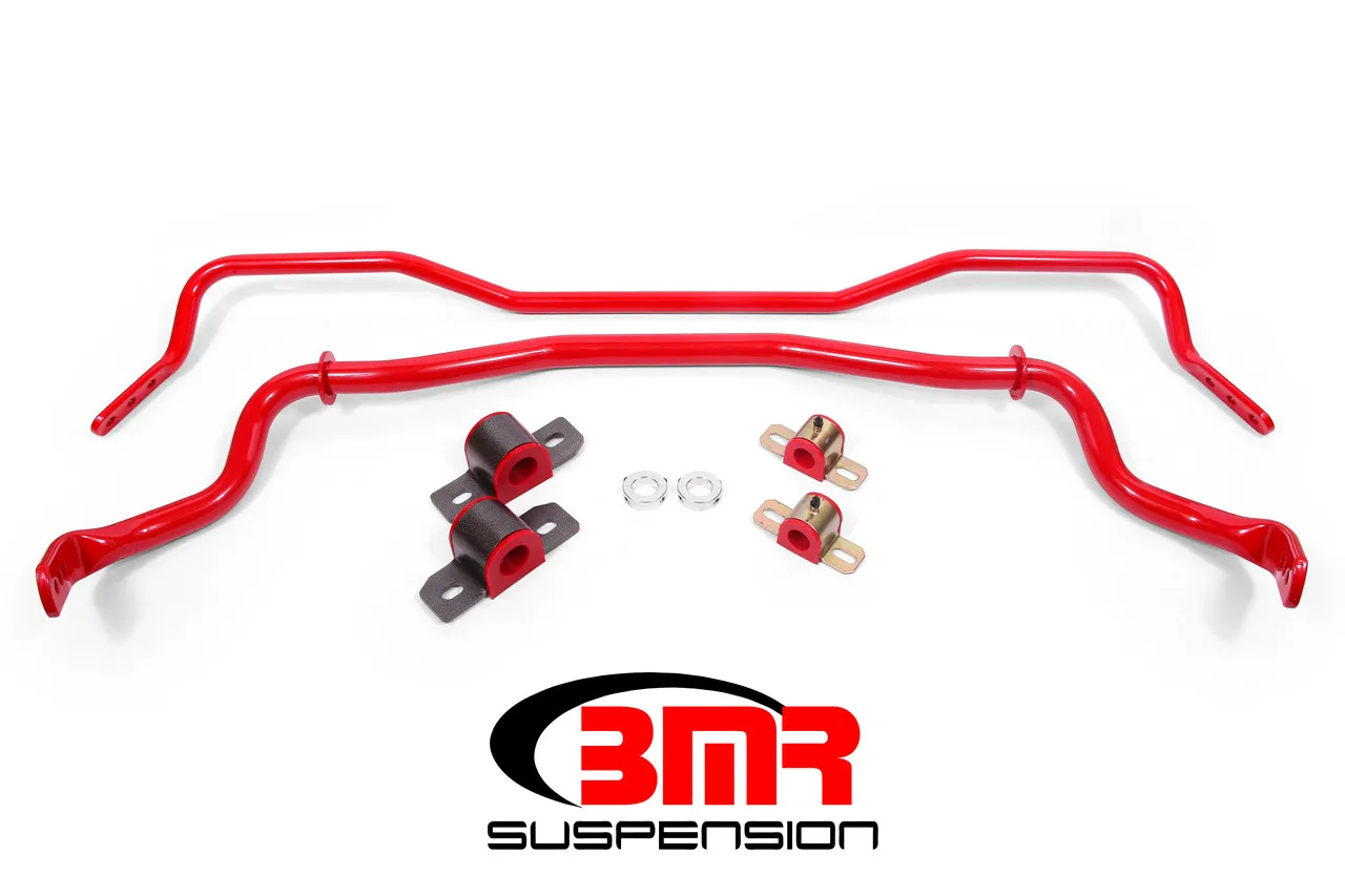 BMR Suspension's SB043 front and rear sway bar kit was designed by factoring in the vehicle weight, application, motion ratio, coil spring rate, and adjustability requirements. Manufactured from heavy-duty 35mm (front) and 25mm (rear)DOM steel tubing, the SB043 is cold formed to better resist torsional fatigue and retain its "memory" far longer than the hot-formed bars used by many competitors. The sway bar is CNC-formed for exact manufacturing tolerances and repeatable high quality.Thrust washers are welded to the front bar to locate the sway bar bushing mounts. This is critical as it properly locates the sway bar and prevents lateral movement during hard cornering maneuvers The SB043 attaches to your S550 Mustang with polyurethane bushings, reducing the deflection from the stock rubber bushings. These bushings are molded from 88-durometer, low-deflection, polyurethane, and are internally fluted to keep grease in the bushing. BMR Suspension designed the SB043 sway bar kit for street performance, autocross, and road race applications. The large adjustable sway bars' three positions give you the versatility to drive to and from the road course or autocross and still out handle the competition with the same sway bars. The SB043 front sway bar gives you a 28%-70% increase in sway bar rate, and the rear bar gives you a 63%-208% increase in rate over the stock bar. These rate increases and adjustability allow you to fine-tune the handling characteristics of your S550 Mustang so you can drive harder through corners with minimal body roll. The hollow design allows for loads of strength in the lightest package possible. This means increased performance with no sacrifices. The SB043 attaches to your Mustang with 88-durometer polyurethane bushings, reducing the deflection from the stock rubber bushings. This allows for more sway bar control, which equals better handling.