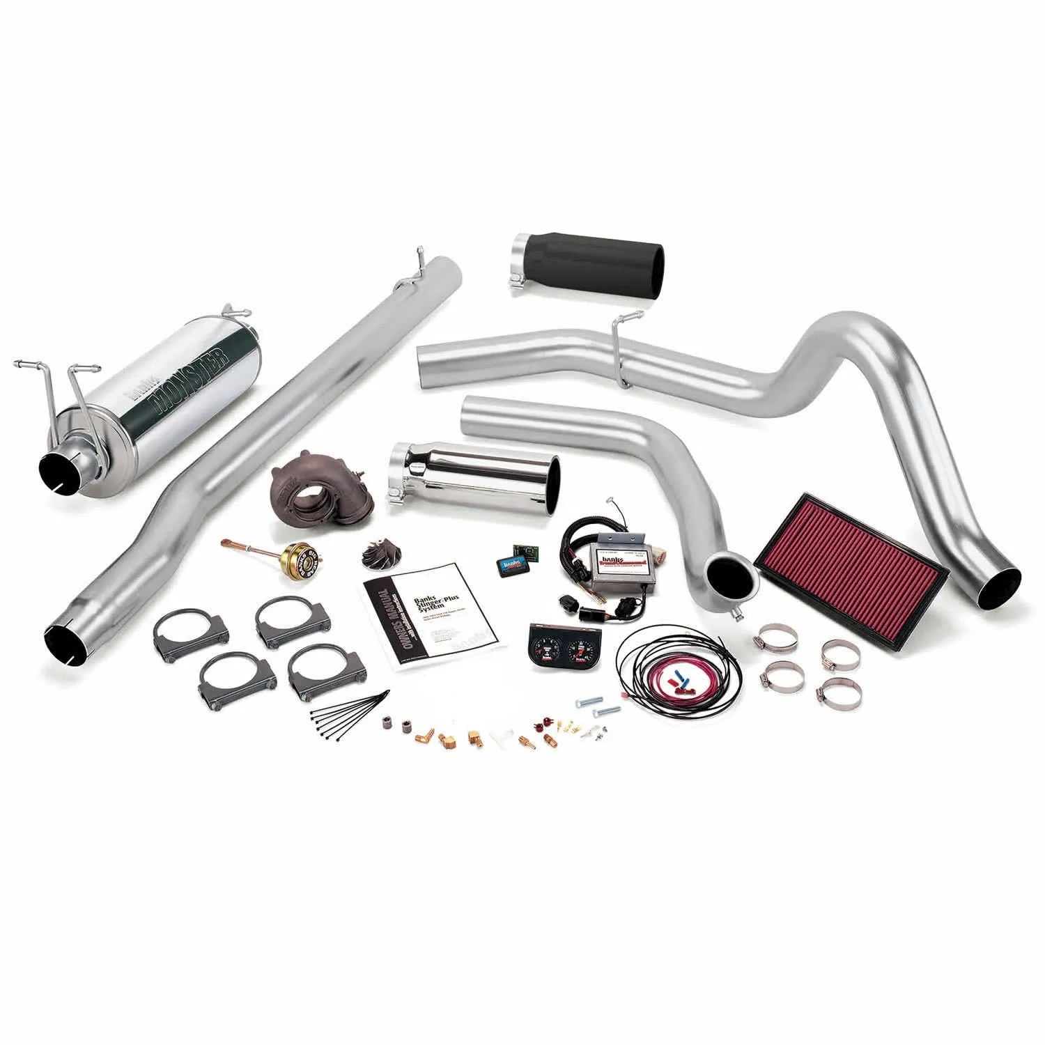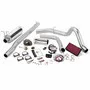 Pickup/Excursion: Banks Stinger-Plus utilizes Quick-Turbo to cut out turbo lag and strengthen turbo performance. Best gains of +91 hp and +162 lb-ft torque deliver more guts when you need 'em, with 11 percent better fuel economy as you haul a trailer or big load. If you like all that pulling-muscle delivered with a kick, Stinger-Plus is an excellent choice. Test vehicle: 1999 F-350 crew cab dually, 2-wheel drive, 4R100 4-speed automatic trans. Towing combined vehicle weight: 20,000 lbs. Horsepower and torque measured at rear wheels. Fitment Notes: Some vehicle configurations require an extension kit for proper fit. 1999 Power Stroke variations: Ford trucks for model year 1999 fall into three categories: 1999, early 1999.5 and late 1999.5. It is important to know the specific model. Check the build date on the tag inside the driver's door, then match: 1999 model year (built prior to 1/99 with catalytic converter), Early 1999.5 model year (built prior to 1/99, no catalytic converter, intake manifold has 2 inch-diameter inlets), Late 1999.5 model year (built on or after 1/99, no catalytic converter, intake manifold has 3 inch-diameter inlets). 1999-2003 F-350 cab-and-chassis (no bed) trucks: If fuel tank is behind rear axle of the vehicle, use systems for F-450/550 trucks. Pickups other than standard-cab long-bed or extended-cab short-bed require Exhaust Extension Kit. Stinger-Plus Bundle, Power System with Single Exhaust, Chrome Tip for use with 1999.5 Ford 7.3L F250/F350, Automatic Transmission. 50 State Compliant CARB E.O. D-161-110
