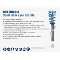 Bilstein B14 (PSS) suspension kits feature ride height adjustability in an OE quality, direct fit package. These kits offer monotube performance dampers with matched springs that are tuned for each specific application. The zinc coated and threaded body design will give you the flexibility to find the perfect ride height setting for your intended use while providing unsurpassed protection against the harshest road elements. B14 (PSS) suspension kits are made in Germany and feature technology tested on the famed Nurburgring.