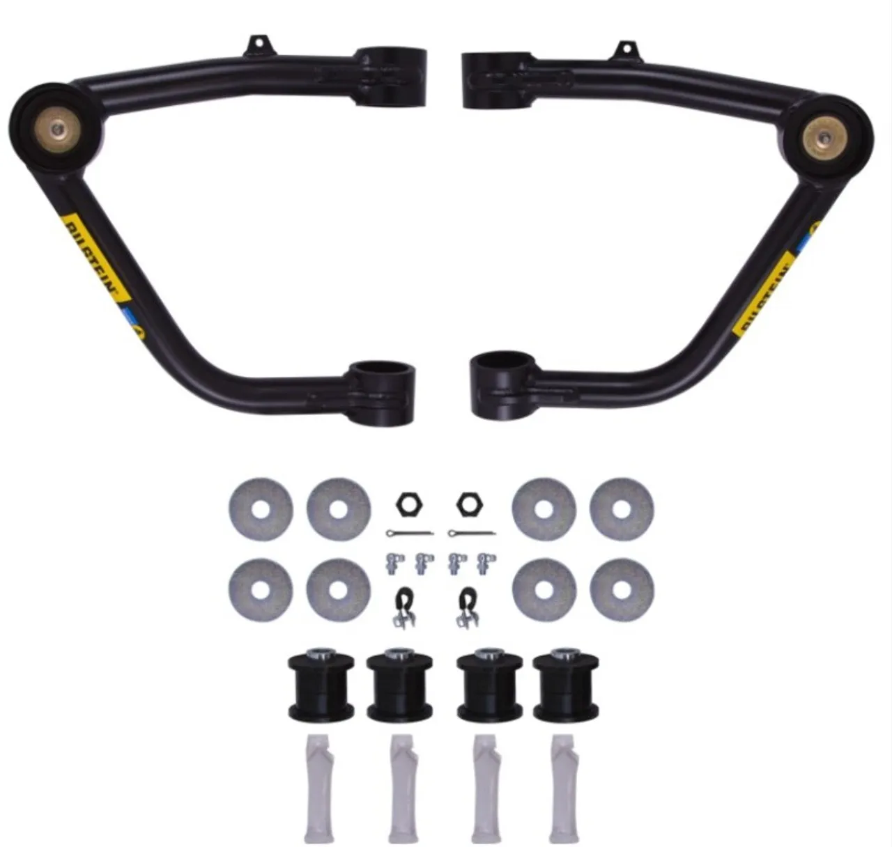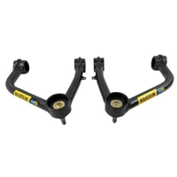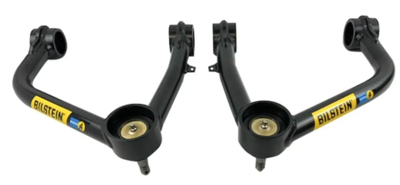 B8 Control Arms are a direct fit upgrade for factory upper control arms on trucks and SUVs. The kit contains a pair of control arms which correct the caster alignment for better straight line stability with lifted suspensions, and the improved pivot angles increase wheel travel and reduce stress on the joints. These strong black powder-coated 4130 chromoly steel arms are a tubular design which allows for more spring and shock clearance and feature greasable polyurethane bushings and heavy duty ball joints for the ideal combination of ride quality and durability with minimal maintenance needed. They come with detailed instructions and all necessary hardware for easy installation and are compatible with all Bilstein shocks and coilover kits. All components are replaceable.
