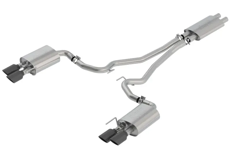 ECE approved systems are those that comply with Economic Commission for Europe (according to ECE-R59) rules for motor vehicles, vehicle systems and components. This system will fit Bullitt models. BORLA system is True Dual. System has Active Valve Exhaust Valves. Front muffler/ resonator contains an internal H-Pipe for increased performance and improved sound. BORLA Cat-Back & Axle-Back exhaust systems feature patented straight-through and multi-core technology to unleash hidden horsepower. Increased exhaust velocity adds power, driving excitement, fuel economy, and the distinctive BORLA Sound of Power respected by motoring enthusiasts everywhere. This system comes with 4" black chrome on T-304 stainless steel tips. Using BORLA Stainless Steel Polish p# 21461 is NOT recommended with these black chrome tips. We suggest cleaning the tips with hot water and a microfiber cloth.