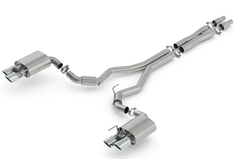 System will fit Bullitt models. NOT recommended for use on Convertibles. 3" diameter system. System contains a merge X-Pipe for increased performance and improved sound. System has Active Valve Exhaust valves. This system features 4" bright chrome on T-304 stainless steel tips. BORLA Cat-Back and Axle-Back exhaust systems feature patented straight-through and multi-core technology designed to unleash hidden horsepower. Increased exhaust velocity adds power, driving excitement, fuel economy, and the distinctive BORLA Sound of Power respected by motoring enthusiasts everywhere.