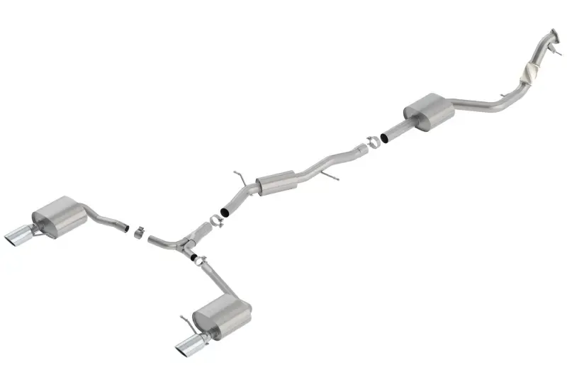 3" diameter system. This system features the aggressive ATAK sound and exits through 4" bright chrome on T-304 stainless steel tips. Systems with black chrome on T-304 stainless steel tips and brushed T-304 stainless steel tips are also available. BORLA Cat-Back and Axle-Back exhaust systems feature patented straight-through and multi-core technology designed to unleash hidden horsepower. Increased exhaust velocity adds power, driving excitement, fuel economy, and the distinctive BORLA Sound of Power respected by motoring enthusiasts everywhere.