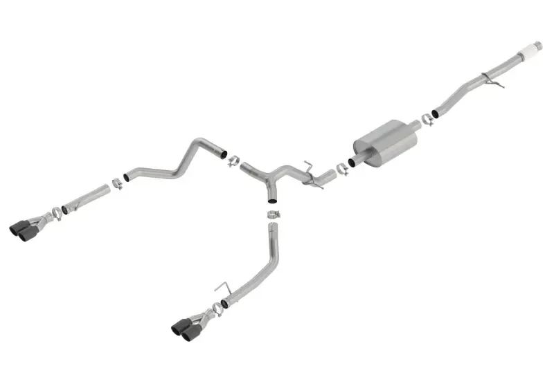 Factory Split Rear Exit Vehicles ONLY. Add Adapter 60708 For Crew Cab with Standard Bed (6' 7") 157" Wheelbase vehicles. This system features the classic S-Type sound level and 3.5" black chrome on T-304 stainless steel tips. Bright chrome on T-304 stainless steel tips and carbon fiber tips are also available. Installation REQUIRES removal of the Factory Valance Tips. Using BORLA Stainless Steel Polish p# 21461 is NOT recommended with these black chrome tips. We suggest cleaning the tips with hot water and a microfiber cloth. BORLA Cat-Back and Axle-Back exhaust systems feature patented straight-through and multi-core technology designed to unleash hidden horsepower. Increased exhaust velocity adds power, driving excitement, fuel economy, and the distinctive BORLA Sound of Power respected by motoring enthusiasts everywhere.