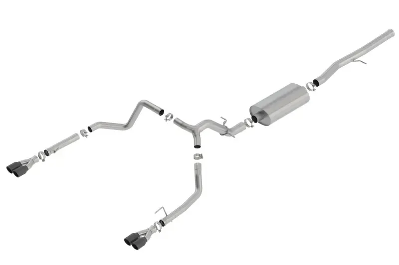 EXCEPT ZR2 & AT4X models. Factory Split Rear Exit vehicles ONLY. This system features a black chrome finish on T-304 stainless steel tips. Using BORLA(r) Stainless Steel Polish p# 21461 is NOT recommended with these black chrome tips. We suggest cleaning the tips with hot water and a microfiber cloth. Add Adapter 60706 for Crew Cab with Standard Bed (6' 7") 157" Wheelbase vehicles. BORLA(r) Cat-Back(tm) and Axle-Back exhaust systems feature patented straight-through and multi-core technology designed to unleash hidden horsepower. Increased exhaust velocity adds power, driving excitement, fuel economy, and the distinctive BORLA(r) Sound of Power respected by motoring enthusiasts everywhere. Each system is built from premium T-304 stainless steel, superior to T-400 series knockoffs (such as 409), to give you the absolute best in performance and durability. Ultra-smooth mandrel bends ensure maximum flow& power, and precision computer numerical control (CNC) manufacturing ensures an accurate fit. Best of all, BORLA(r) stands behind every system with a Million-Mile Warranty. Just what you'd expect from the world's most experienced (and most winning) exhaust brand.