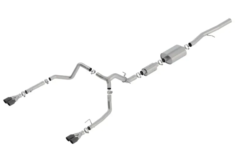 EXCEPT ZR2 & AT4X models. Factory Split Rear Exit vehicles ONLY. This system features a black chrome finish on T-304 stainless steel tips. Using BORLA(r) Stainless Steel Polish p# 21461 is NOT recommended with these black chrome tips. We suggest cleaning the tips with hot water and a microfiber cloth. Add Adapter 60706 for Crew Cab with Standard Bed (6' 7") 157" Wheelbase vehicles. Replace the small muffler behind the primary muffler in the BORLA(r) "S-Type" system with Polyphonic Harmonizer 60680 to attain the "ATAK(r)" sound level (louder than "S-Type"). Optional "True Dual" Cat-Back(tm) system available, see the Related Parts section. BORLA(r) Cat-Back(tm) and Axle-Back exhaust systems feature patented straight-through and multi-core technology designed to unleash hidden horsepower. Increased exhaust velocity adds power, driving excitement, fuel economy, and the distinctive BORLA(r) Sound of Power respected by motoring enthusiasts everywhere. Each system is built from premium T-304 stainless steel, superior to T-400 series knockoffs (such as 409), to give you the absolute best in performance and durability. Ultra-smooth mandrel bends ensure maximum flow & power, and precision computer numerical control (CNC) manufacturing ensures an accurate fit. Best of all, BORLA(r) stands behind every system with a Million-Mile Warranty. Just what you'd expect from the world's most experienced (and most winning) exhaust brand.