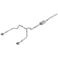 EXCEPT ZR2 & AT4X models. Factory Split Rear Exit vehicles ONLY. This system features unique BORLA(r) carbon fiber tips with bright centers. Add Adapter 60706 for Crew Cab with Standard Bed (6' 7") 157" Wheelbase vehicles. System features BORLA(r)'s aggressive ATAK(r) muffler and Polyphonic Harmonizer Technology which utilizes patented units that contain pipes of different diameters and lengths to create multiple exhaust notes that harmonize to deliver a clean, rich, full-bodied sound. Replace the Polyphonic Harmonizer behind the muffler in the ATAK(r) system with muffler 60679 to attain the "S-Type" sound level (quieter than ATAK(r)). BORLA(r) Cat-Back(tm) and Axle-Back exhaust systems feature patented straight-through and multi-core technology designed to unleash hidden horsepower. Increased exhaust velocity adds power, driving excitement, fuel economy, and the distinctive BORLA(r) Sound of Power respected by motoring enthusiasts everywhere. Each system is built from premium T-304 stainless steel, superior to T-400 series knockoffs (such as 409), to give you the absolute best in performance and durability. Ultra-smooth mandrel bends ensure maximum flow& power, and precision computer numerical control (CNC) manufacturing ensures an accurate fit. Best of all, BORLA(r) stands behind every system with a Million-Mile Warranty. Just what you'd expect from the world's most experienced (and most winning) exhaust brand.