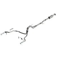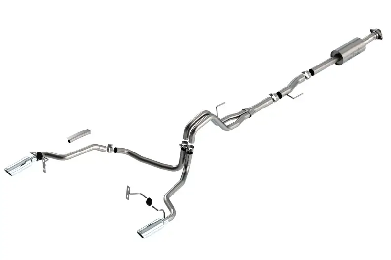 EXCEPT 3.5L V6 PowerBoost, Raptor, Tremor, and Black Appearance Package. The BORLA Cat-Back system 140863 was specifically designed to enhance the power and sound of the Ford F-150 equipped with 2.7L and 3.5L Engines. It includes 4" bright chrome on T-304 stainless steel tips and a split rear exit configuration. The entire system is made of T-304 stainless steel and utilizes computer numerical control (CNC) manufacturing techniques that ensure an accurate fit. This system features the S-Type sound that gives you an aggressive sound with no drone. It is also available with 4" black chromed tips (part number 140863BC). There are additional systems available for the 2.7L and 3.5L F-150 that offer different options for sound level, tip finish and tip Exits. Add Adapter 60556 for Crew Cab with Standard Bed (6' 7") 157.2" Wheelbase vehicles. Add Adapter 60564 for Extended Cab with Long Bed (8' 2") 164.1" Wheelbase vehicles. All this is backed by our unsurpassed Million Mile Warranty.System Features: Cat-Back System Split Rear Exit 4" Bright Chrome On T-304 Stainless Steel Tips S-Type Sound Level T-304 Stainless Steel Construction Bolt-On Installation Million Mile Warranty
