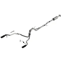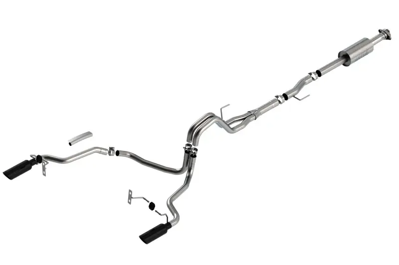 EXCEPT 3.5L V6 PowerBoost, Raptor, Tremor, and Black Appearance Package. The BORLA Cat-Back system 140863BC was specifically designed to enhance the power and sound of the Ford F-150 equipped with 2.7L and 3.5L Engines. It includes 4" black chrome on T-304 stainless steel tips and a split rear exit configuration. Using BORLA Stainless Steel Polish p# 21461 is NOT recommended with these black chrome tips. We suggest cleaning the tips with hot water and a microfiber cloth. The entire system is made of T-304 stainless steel and utilizes computer numerical control (CNC) manufacturing techniques that ensure an accurate fit. This system features the S-Type sound that gives you an aggressive sound with no drone. It is also available with 4" bright chromed tips (part number 140863). There are also systems available for the 2.7L and 3.5L F-150 that offer different options for sound level, tip finish and tip Exits. Add Adapter 60556 for Crew Cab with Standard Bed (6' 7") 157.2" Wheelbase vehicles. Add Adapter 60564 for Extended Cab with Long Bed (8' 2") 164.1" Wheelbase vehicles. All this is backed by our unsurpassed Million Mile Warranty.System Features: Cat-Back System Split Rear Exit Black Chrome On T-304 Stainless Steel Tips S-Type Sound Level T-304 Stainless Steel Construction Bolt-On Installation Million Mile Warranty